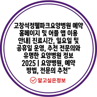 ✅ 고창석정웰파크요양병원의 예약 방법과 어플 이용법을 지금 확인해 보세요.