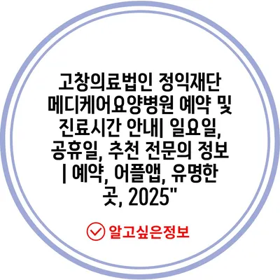 고창의료법인 정익재단 메디케어요양병원 예약 및 진료시간 공지| 일요일, 공휴일, 추천 전연락 정보 | 예약, 어플앱, 유명한 곳, 2025″ 에 대해 자주 묻는 질문 TOP 5