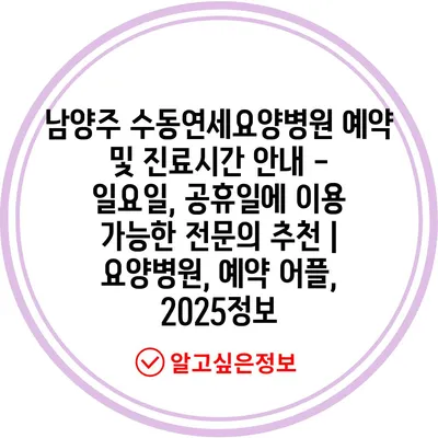 남양주 수동연세요양병원 예약 및 진료시간 공지 – 일요일, 공휴일에 이용 가능한 전연락 추천 | 요양병원, 예약 어플, 2025정보에 대해 자주 묻는 질문 TOP 5
