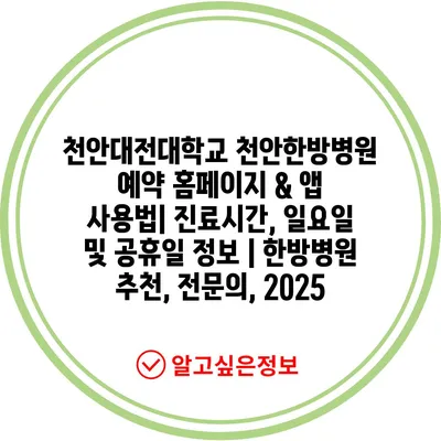 천안대전대학교 천안한방병원 예약 홈페이지 & 앱 사용법| 진료시간, 일요일 및 공휴일 정보 | 한방병원 추천, 전연락, 2025 에 대해 자주 묻는 질문 TOP 5