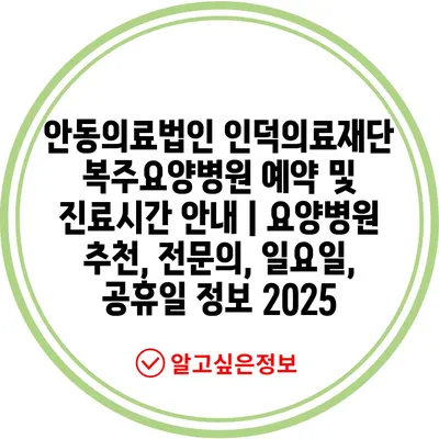 안동의료법인 인덕의료재단 복주요양병원 예약 및 진료시간 공지 | 요양병원 추천, 전연락, 일요일, 공휴일 정보 2025 에 대해 자주 묻는 질문 TOP 5