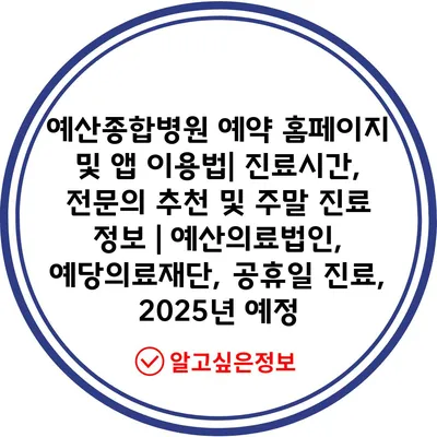 예산종합병원 예약 홈페이지 및 앱 이용법| 진료시간, 전문의 추천 및 주말 진료 정보 | 예산의료법인, 예당의료재단, 공휴일 진료, 2025년 예정