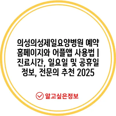 의성의성제일요양병원 예약 홈페이지와 어플앱 사용법 | 진료시간, 일요일 및 공휴일 정보, 전문의 추천 2025